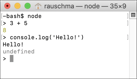Figure 10.2: Starting and using the Node.js REPL (interactive command line).